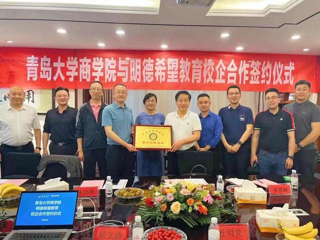 2022年5月20日,新葡萄官方网与明德希望教育教学实践基地签约挂牌仪式在青岛富源集团会议室举行。富源集团董事长崔文涛、副总裁韩磊、明德希望教育总经理杨言鑫、副总经理司诺、青岛校区主任陈之圣、商学院党委书记王功勇、党委副书记尼梅颉、学工办主任李鹏、团委书记姜雪峰出席了共建仪式。