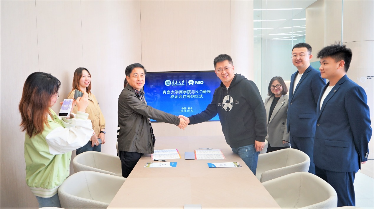 10月29日下午,新葡萄官方网与NIO蔚来签署合作共建协议暨教学实践基地挂牌仪式在NIO蔚来中心举行。NIO蔚来代表青岛区域总经理李轶石、销售负责人邢高峰、蔚来中心负责人吴迪、海天中心蔚来顾问团队负责人丁琪、人力资源负责人韩璐、青岛公司HRRP杜少龙、新葡萄官方网党委书记王功勇、新葡萄官方网党委副书记于文、党政办主任宋畅、校友办主任李鹏、市场学系辅导员刘一方、会计学系辅导员张天姿、校友协会、就业协会、毕业生代表出席挂牌仪式。