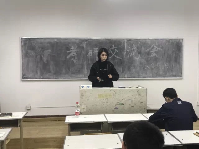 随后,张奕鹤同学上台分享经验。她首先提出:为考研做准备不能只做表面功夫,要提高学习效率。此外,她特别提到了英语阅读的学习方法,即:精读、翻译。这样不仅可以检验背单词的效果,还能练习翻译水平、培养语感,一举三得。在进行英语作文的准备过程中,不能刻意记模板,而要根据往年参考答案总结自己的模板,以求新颖。
