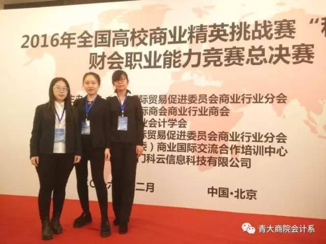2016年全国高校商业精英挑战赛财会职业能力竞赛全国总决赛12月份在北京举行。我会计学系学生在本次赛事的获奖等级、获奖总量和专业能力等方面均表现突出。代表参加全国总决赛的五支队伍中,翟凤阳、李萌、陈娜和黄佳珍、吴飘飘、柳梦梦等同学组成的两支队伍获得全国一等奖,胡亚雯等9名同学组成的三支代表队获得全国二等奖。