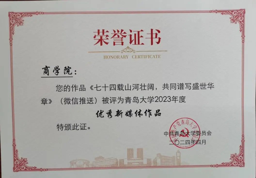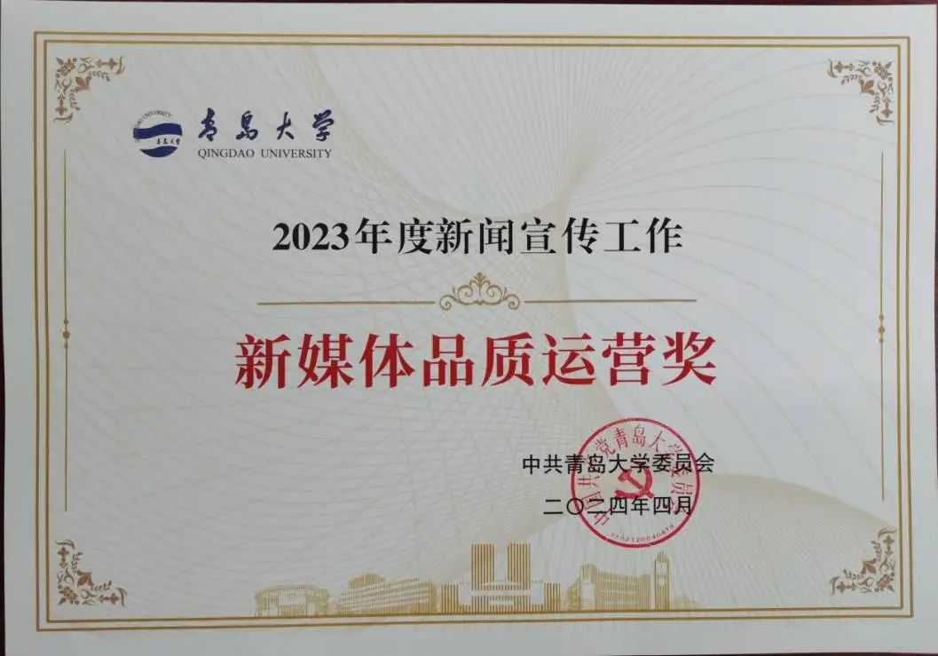 “新葡萄官方网”微信公众号荣获2023年度新闻宣传工作“新媒体品质运营奖”。同时,推送《七十四载山河壮阔,共同谱写盛世华章》被评为新葡萄官方网2023年度“优秀新媒体作品”。
