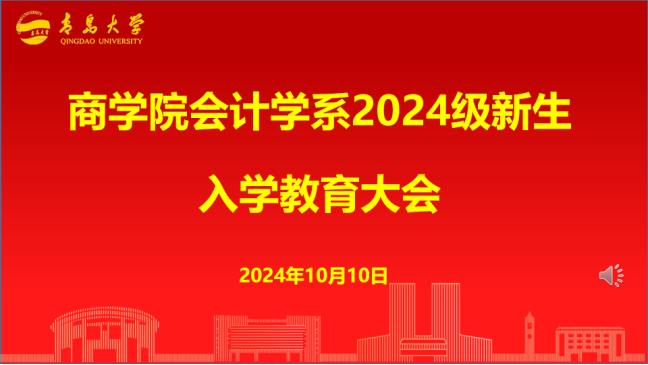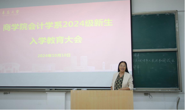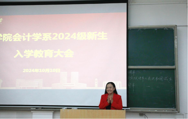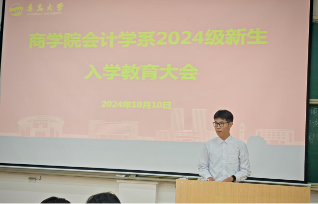 范英杰首先代表全体教职工欢迎2024级新同学加入会计学系大家庭。她向同学们介绍了会计学系的历史沿革、师资条件、人才培养目标和未来择业方向,希望2024级同学们在青大园中勇于追梦,敢于挑战,共渡美好青春。