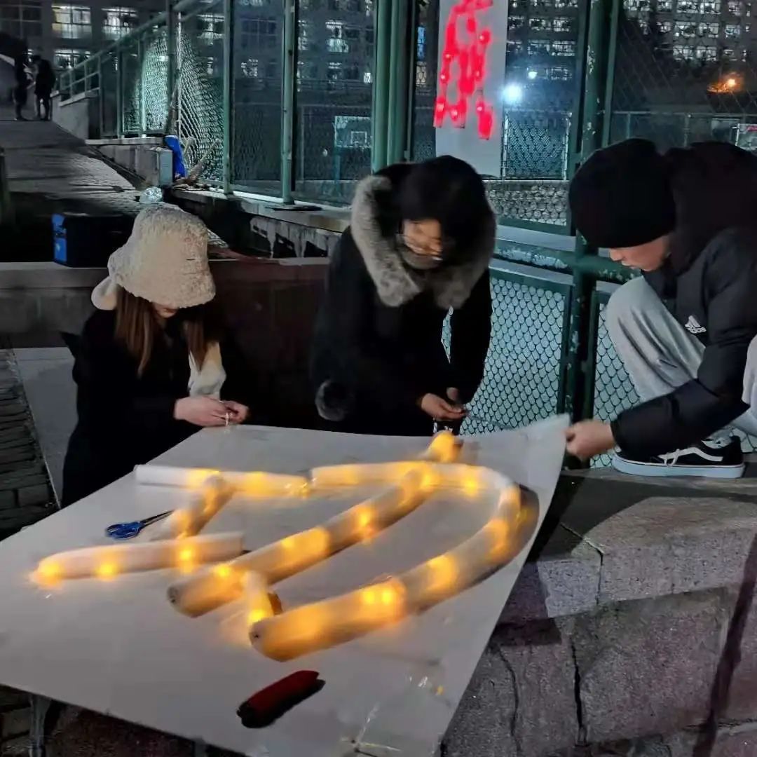 3.晚上九点半到十一点半,学生会成员们分别在图文中心、篮球场和四号楼到六号楼的沿路集合,将事先贴在画稿上的双面胶撕掉,贴上色彩斑斓的荧光棒,在贴荧光棒的过程中,同学们都积极参与,纷纷为鼓励学长学姐考研贡献自己的力量。