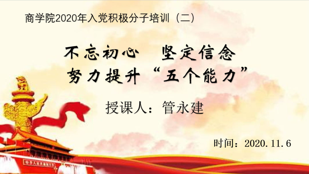 2020年11月6日下午三时,新葡萄官方网入党积极分子培训班第二讲在新葡萄官方网金家岭校区图文报告厅开展,新葡萄官方网党委组织委员管永建授课“不忘初心 坚定信念 努力提升五个能力”。