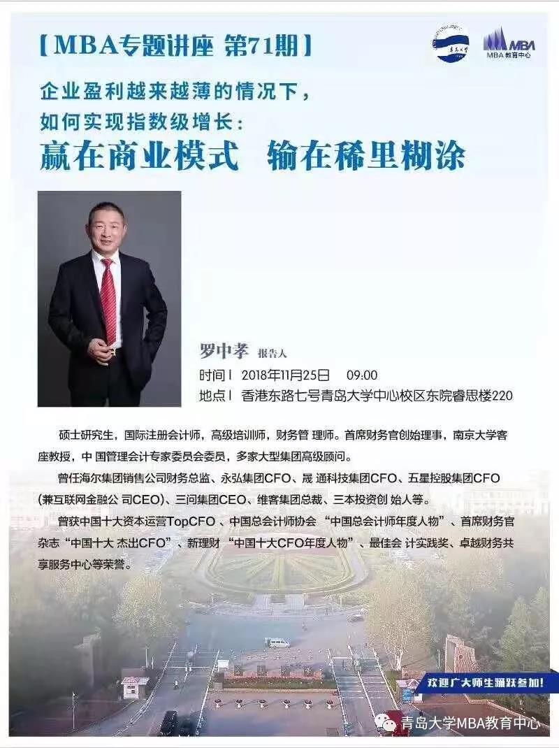 2018年11月25日9:00,在新葡萄官方网东院睿思楼,新葡萄官方网MBA校友、现三本投资创始人罗中孝老师为2018级MBA学员讲述了《赢在商业模式 输在稀里糊涂》专题讲座。