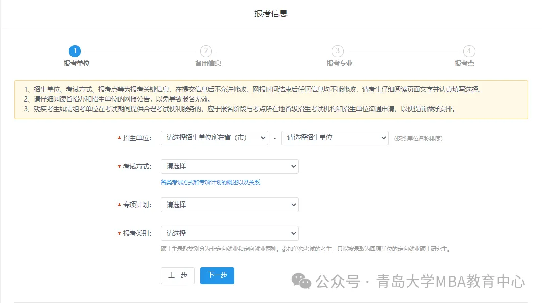 请先填写1考生信息,再填写2报考信息。请点击网报公告,查看招生单位(报考院校)的公告,报考点(考试地点)的公告,请务必仔细阅读报考点公告。