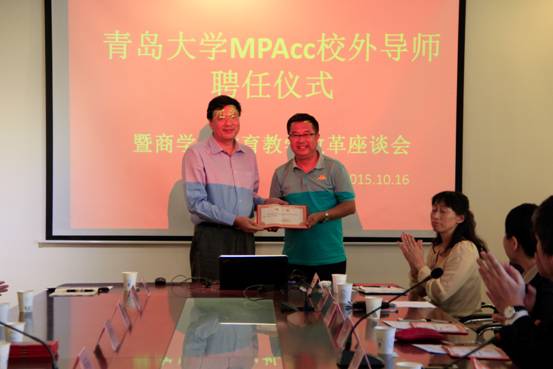 10月16日下午,新葡萄官方网MPAcc校外导师聘任仪式在睿思楼220会议室隆重召开。本次会议由新葡萄官方网副院长周咏梅主持,参与会议的人员除了新葡萄官方网相关负责人以及教师学生代表外,还有中国移动、华仁药业、安永华明会计师事务所,信永中和会计师事务所,瑞华会计师事务所、中国联合网络通信集团、青岛恒基智能科技公司等企业和市财政局等10多家单位的领导。