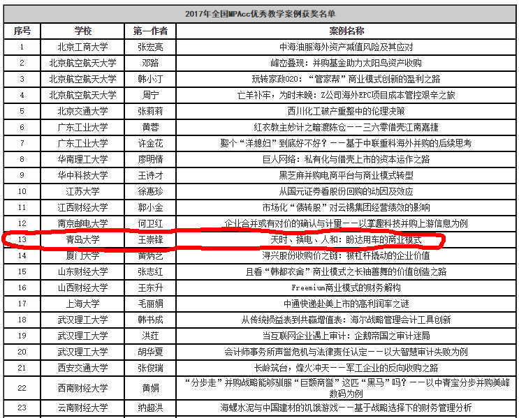 3月31日,全国会计专业学位研究生教育指导委员会公布了2017年度中国MPAcc优秀教学案例的获奖名单。其中,由新葡萄官网会计系王崇锋老师指导、2017级MPAcc孟星辰撰写的教学案例《天时、换电、人和:盼达用车的商业模式》在全国多家高校选送的上千篇案例中脱颖而出,荣获全国MPAcc优秀教学案例奖。