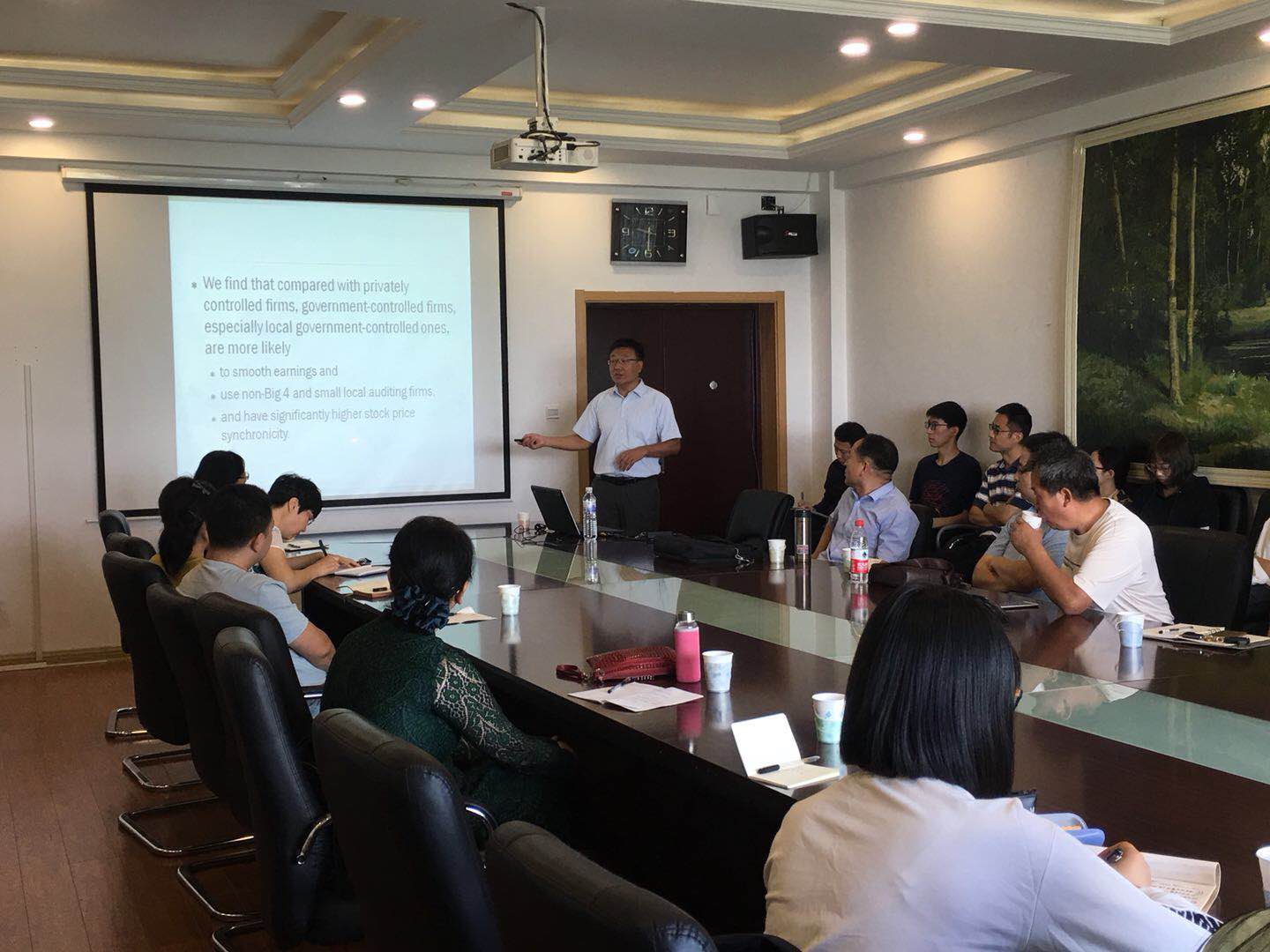 2018年9月27日上午9时,暨南大学管理学院会计系教授、博士生导师李东辉教授应邀在新葡萄官方网办公楼410进行了题为"Ultimate Ownership,Crash Risk,and Split-share StructureReform in China"的精彩报告,本次讲座由新葡萄官方网副院长周咏梅老师主持,新葡萄官方网老师及会计系研究生聆听了此次讲座。